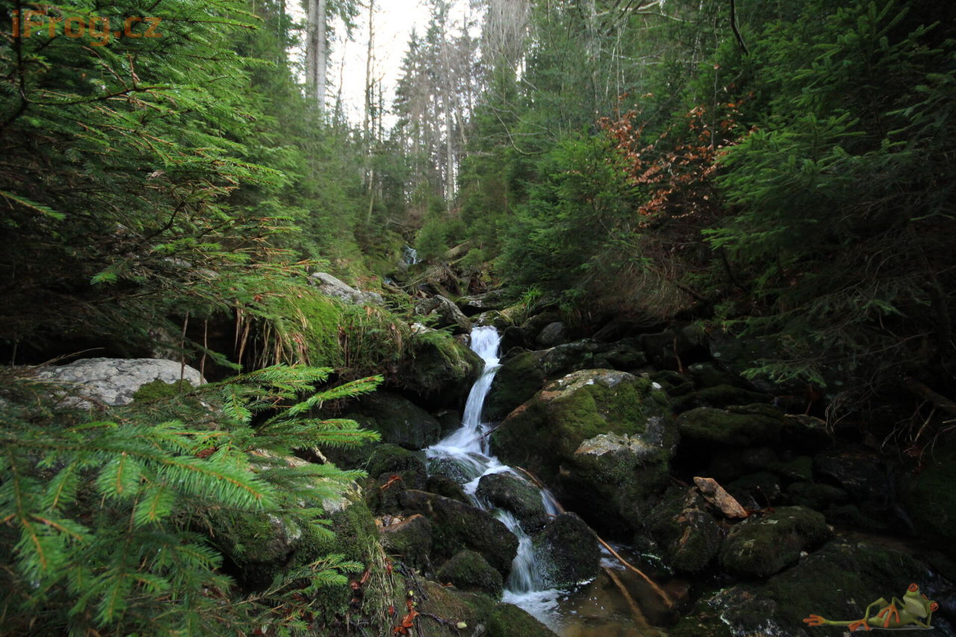 - Soutěska na Černém potoce je necelý kilometr pod Černým jezerem na jeho výtoku - Černém potoce. Na kótě 850 metrů Černý potok překonává lesní cesta. Z mostu na této cestě, proti proudu potoka, je před zraky turistů ukryt zhruba 3 m vysoký vodopád a následné kaskády.