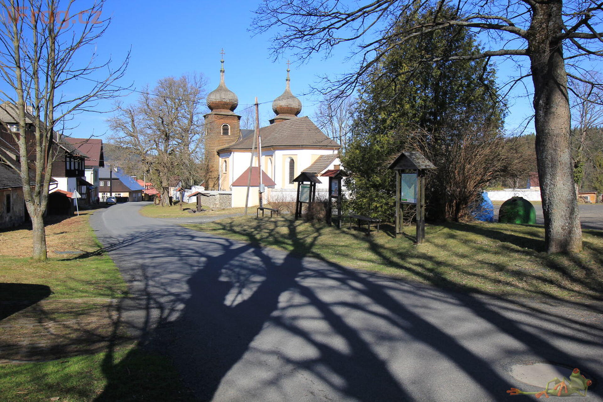 V roce 1698 byla postavena kaple, která byla přestavěna na současný barokní kostel (Kostel svaté Anny) podle návrhu architekta M. A. Gilmettiho v letech 1718–1721. V průčelí kostela jsou dvě věže kryté šindelem. Na oltářích jsou obrazy svaté Anny a Nejsvětější Trojice od W. Stoibra (1870). Lustry v kostele byly výrobky zdejších zaniklých skláren, ale při rekonstrukci kostela se odvezly do Německa a sem byly přivezeny jiné. Náhrobní kameny z 18. a 19. století náleží převážně významným sklářským rodinám Gerlů, Hafenbrädlů a Adlerů. U kostela stojí památný strom lípa malolistá, stáří 300 let.
